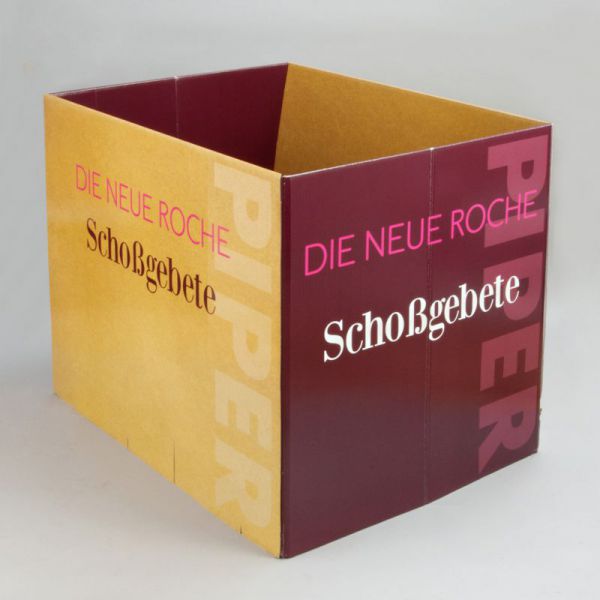 Buchschütte über einer Europalette, 4-farbig bedruckter GD2 auf Well- pappe kaschiert. Erhöhung durch ein innenliegendes Wellpappkreuz. Die Verkaufshilfe wird flach beim Buchvertrieb angeliefert und dort aufgerichtet, auf die Europalette gesetzt und laut vorgegebenen Plan bestückt.