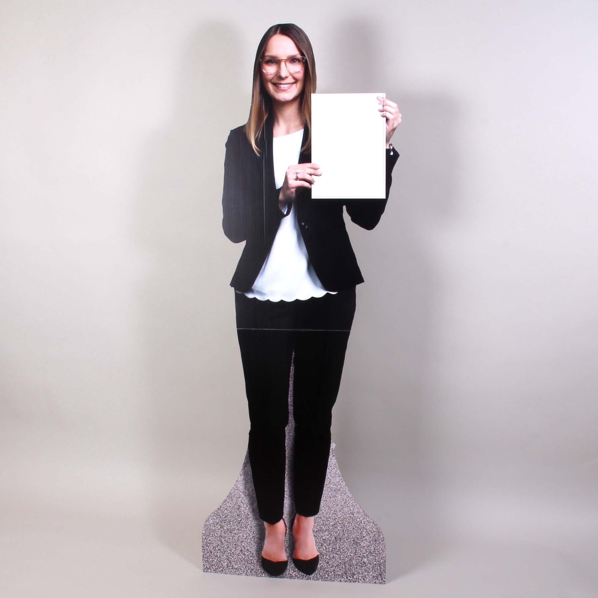 Lebensgroße Pappfigur, in den Händen ein Wechselbildhalter aus Acryl, zum Einschieben tagesaktueller Angebotsblätter.