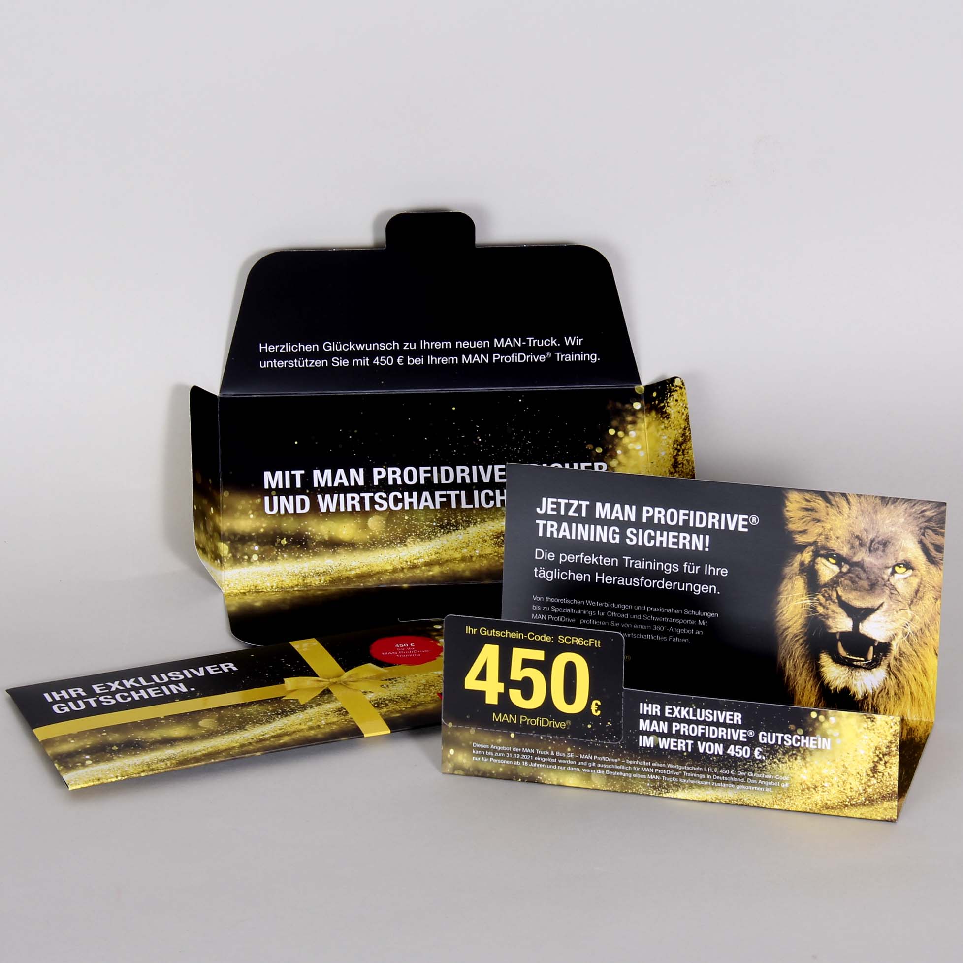 Zweiteiliges Mailing, bestehend aus einem Klappkuvert mit Steckmechanismus und einem gestanztem Innenteil mit perforiertem Gutschein. Der Druck wurde mit einer Mattfolie beidseitig kaschiert, einzelne Teile dann mit hochglänzendem UV-Spotlack hervorgehoben.