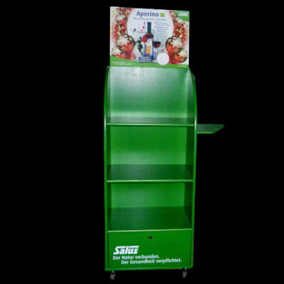 Verkaufsregal mit Leuchtkasten für Blister- und/oder Regalware im Format 500 x 500 x 1400 mm. Ausführung in 1 mm Stahlblech, Rückwand mit Schlitzen und Eurolochung, seitlich 2 farbige Zierwangen, Bodenplatte mit Stellfüßchen, alle Teile pulverbeschichtet.