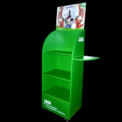 1/4 Palettendisplay aus kaschierter Wellpappe, 4 fbg. bedruckt und lackiert, mit Topschild und Palettenschürze.